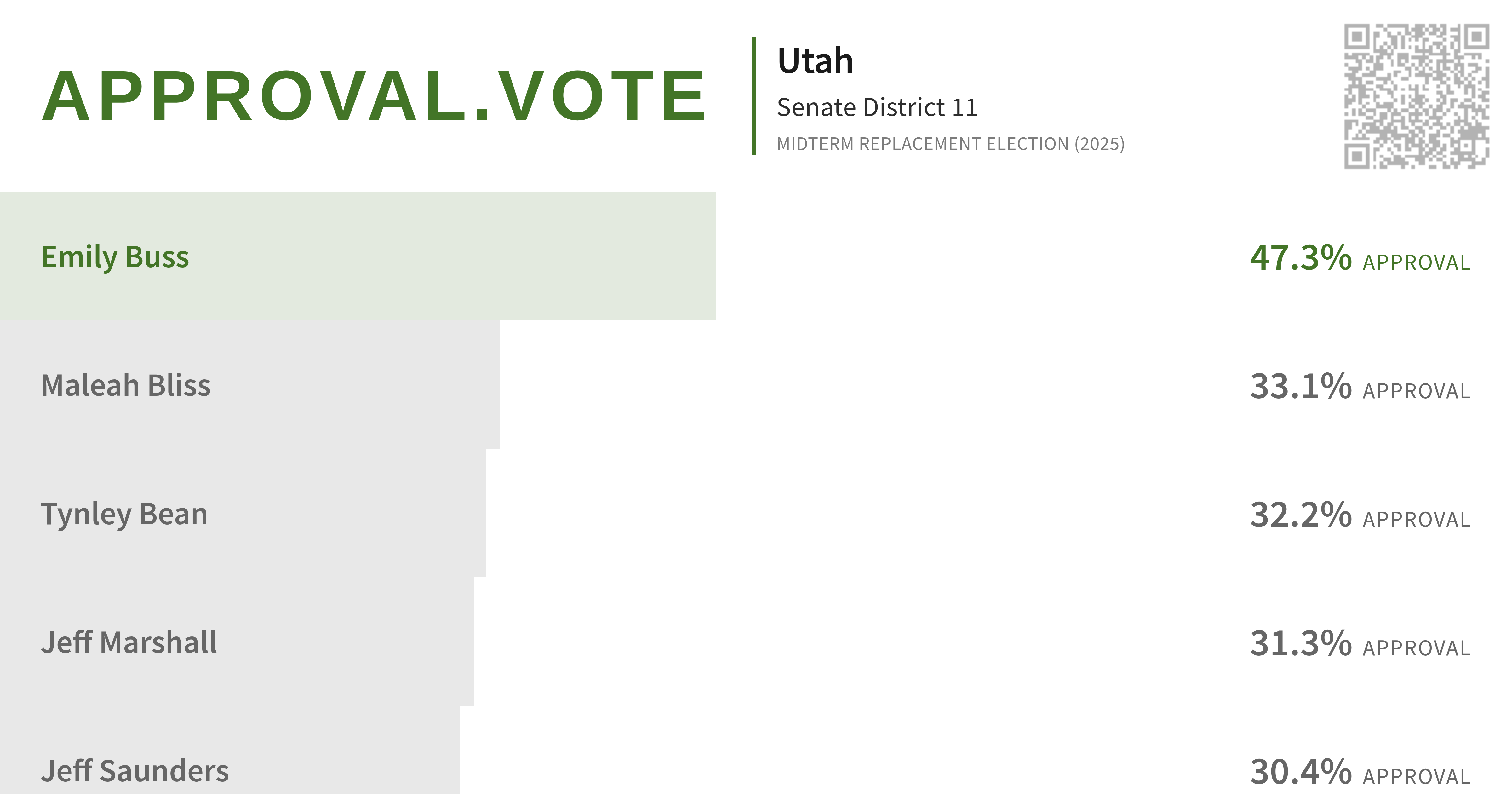 The Utah Midterm Replacement Election was held on December 11, 2025. Emily Buss was the winner out of 5 candidates. Approval voting election conducted via SIV.org. Vote totals include both digital and paper ballots. Detailed analysis (co-approval matrix, voting patterns) is based on digital ballots only (1,300 ballots). Paper ballots: Jeff Marshall +11, Emily Buss +10, Jeff Saunders +8, Tynley Bean +7, Maleah Bliss +6.